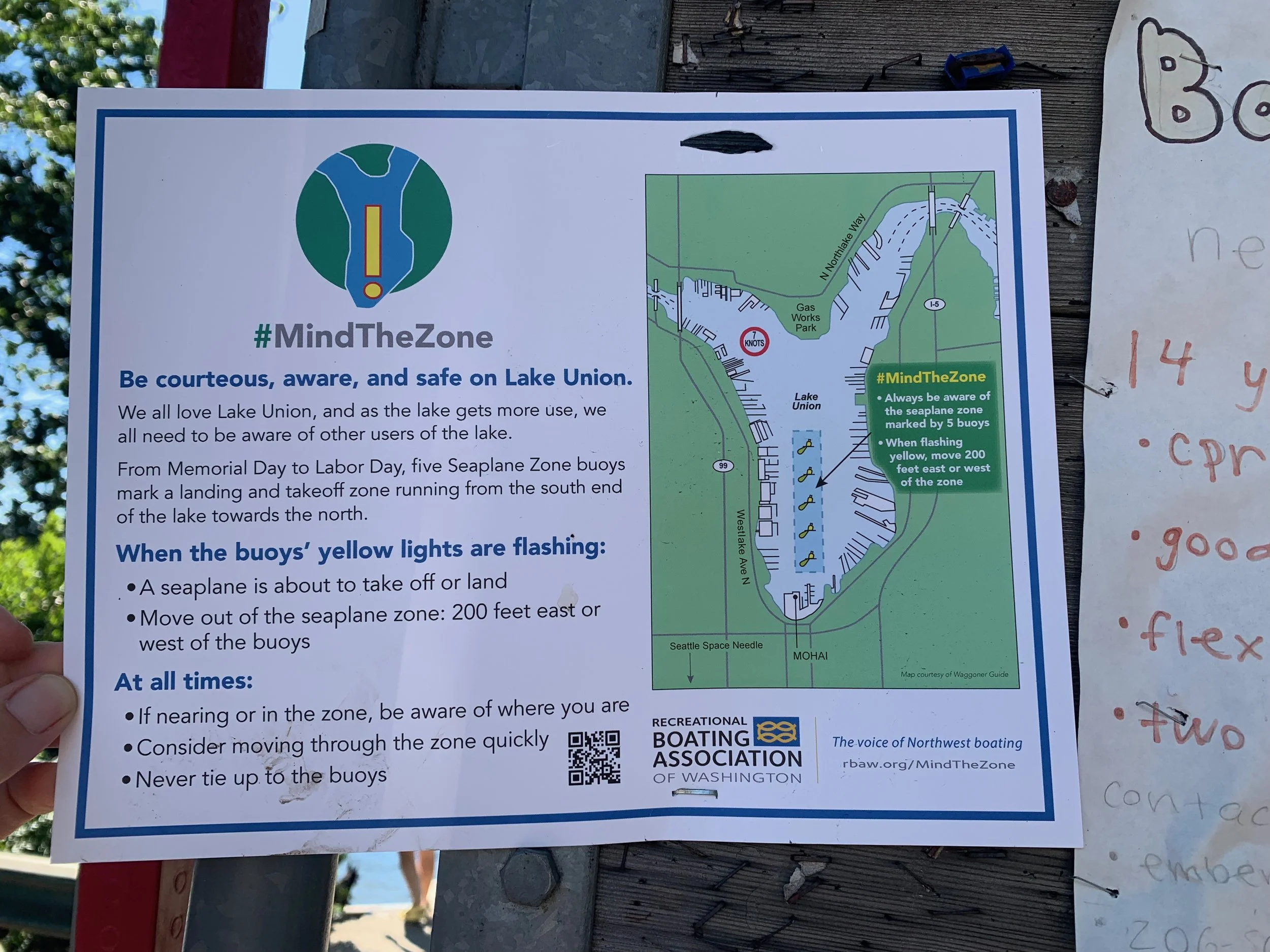 The unlawful buoy marking violation is made even more problematic by the unlawful campaign #MindTheZone brought to your attention earlier this summer which continuously seeks to enforce a non-existent and illegal 400-foot “seaplane zone” during summer months. This campaign was developed in violation of DNR’s Right of Entry Agreement which makes no reference to a seaplane zone and specifically requires significant public outreach and input prior to finalizing any campaign. Aquatic Lands Right of Entry No. 23-B92236, Exhibit B, Section 2.c. Here are photos of the campaign materials distributed around Lake Union: